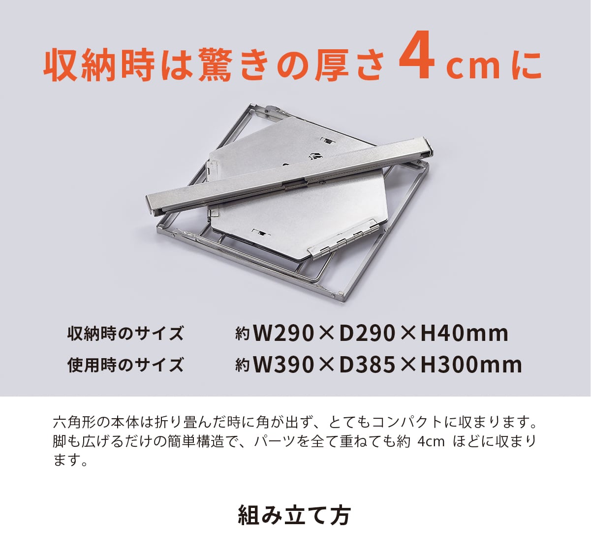焚き火受けを開いて、底を取り付けて、台に乗せるだけだから、すぐに焚き火が始められ、片付けも楽々スムーズです。